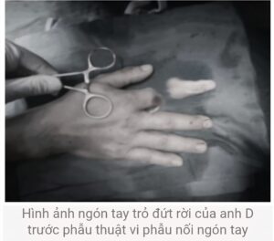 Tại phòng mổ, kíp phẫu thuật cấp cứu được triển khai với sự phối hợp đa chuyên khoa: vi phẫu tạo hình, gây mê hồi sức, chấn thương chỉnh hình… Hai kíp phẫu thuật được triển khai song song, một kíp làm sạch và chuẩn bị phần ngón đứt rời, kíp còn lại chuẩn bị phần mỏm cụt. Xương ngón được định vị và cố định bằng kim chuyên dụng để tạo trục vững, hệ thống gân và dây chằng được phục hồi. Đặc biệt là thần kinh và các mạch máu nhỏ li ti chỉ khoảng 0,8 – 1mm được phục hồi với độ chính xác cao dưới kính hiển vi phẫu thuật với dụng cụ đặc biệt nhằm đảm bảo phục hồi lưu thông tưới máu cho phần đứt rời.